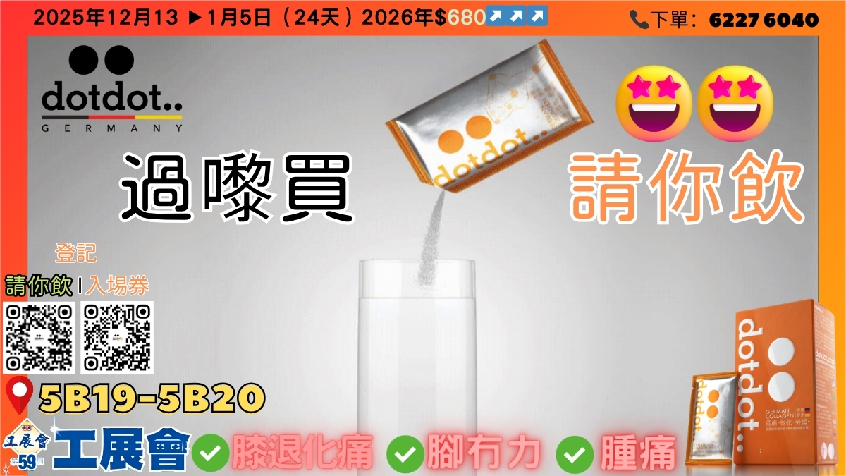 🗒️登記後!到攤位5B19購買(德國膠原🇩🇪一盒或以上),出示「請你飲」登記,同事安排沖一杯給你服用體驗✨